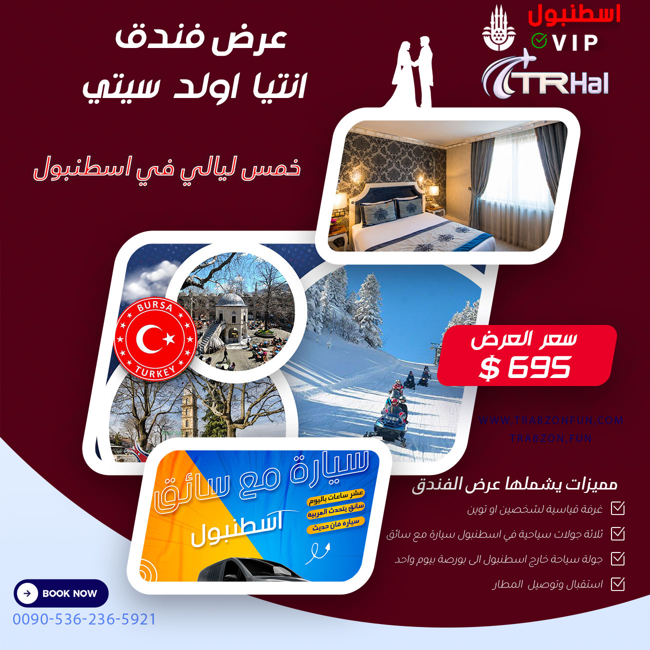افضل عروض السفر لتركيا اسطنبول في فندق انتيا اولد سيتي يتضمن العرض سيارة مع سواق خمسة ليالي و ستة ايام ضمنها رحلة بورصة